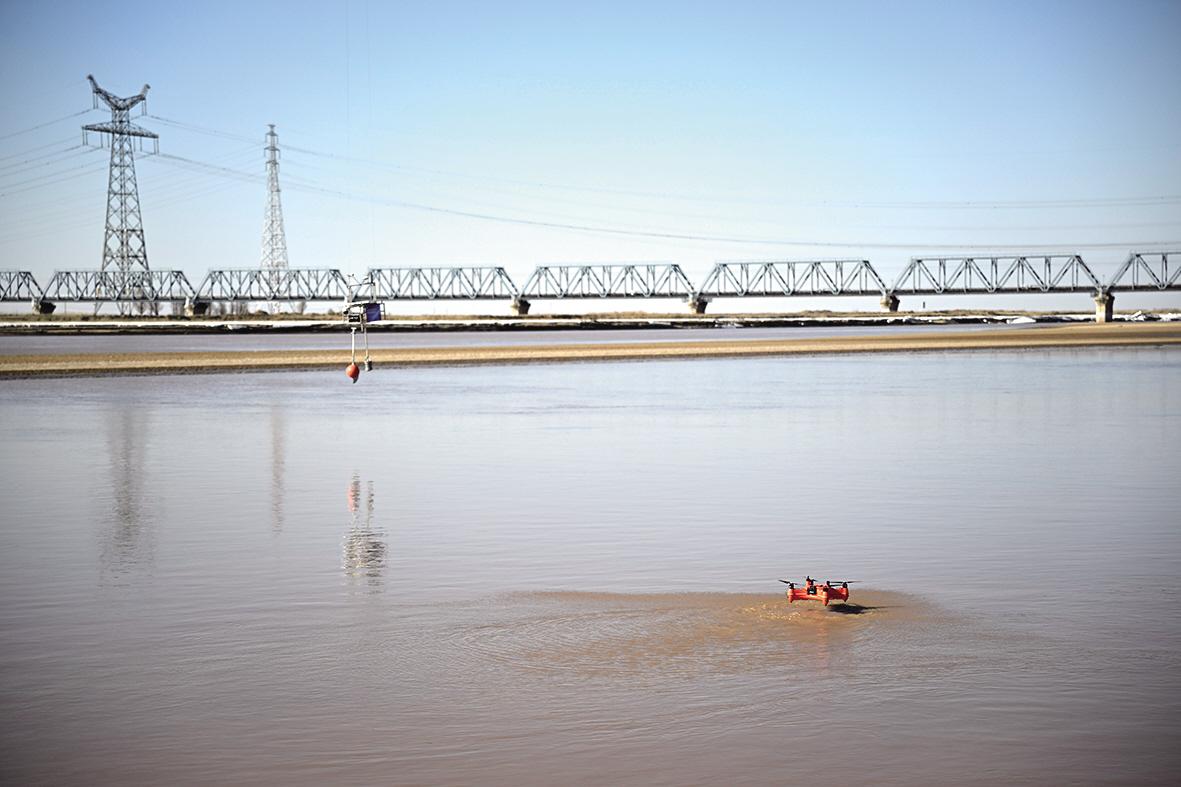 近日,隨著氣溫回升,黃河內(nèi)蒙古段多處已進入開河期,有關(guān)部門有序開展防凌工作,確保黃河內(nèi)蒙古段全線穩(wěn)定開河。圖為3月17日在內(nèi)蒙古包頭市黃河水利委員會寧蒙水文水資源局包頭水文站拍攝的測深測速兩棲無人機。