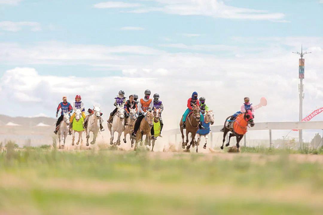 藍(lán)天白云下,駿馬馳騁。技藝精湛的騎手們?cè)隈R背上閃轉(zhuǎn)騰挪、策馬揚(yáng)鞭,“噠噠”蹄聲卷起塵土,一場(chǎng)精彩的賽馬“村超”正在百靈那達(dá)慕文化產(chǎn)業(yè)園上演。