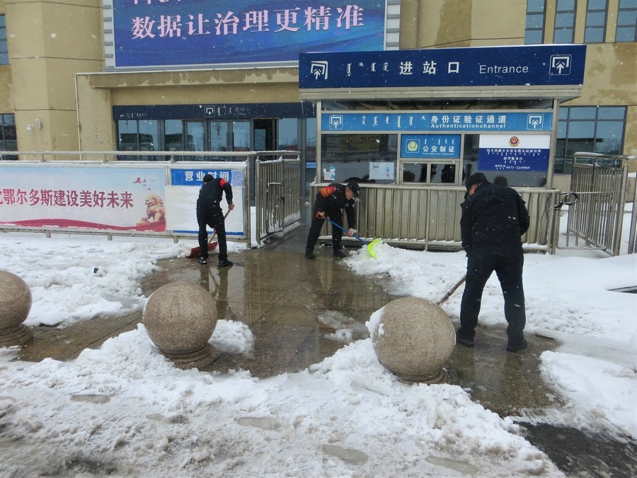 4月3日,受極端惡劣天氣影響,鄂爾多斯市東勝東車站派出所轄區(qū)內(nèi)連降雨夾雪,車站進出站口積雪、積水嚴重,給旅客群眾出行帶來不便。