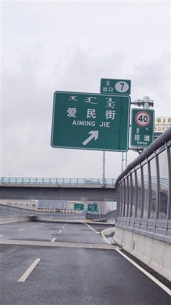 當(dāng)日,記者駕車來到哲里木路高架橋,沿南向北方向行駛,看到沿路提示愛民街下行匝道口的路牌一共有4塊,每塊上都有中文和拼音,顯示為“愛民街”“AIMING JIE”。記者從愛民街下行匝道口到達愛民街與哲里木路輔路交會處,在東西方向的愛民街路口發(fā)現(xiàn)路牌名是由中文、蒙古文和拼音組成,其中拼音為“AIMIN JIE”。因呼市地區(qū)方言中,“MING”與“MIN”的發(fā)音不易分辨,這也是為什么網(wǎng)友在視頻中說用方言命名路名的原因。