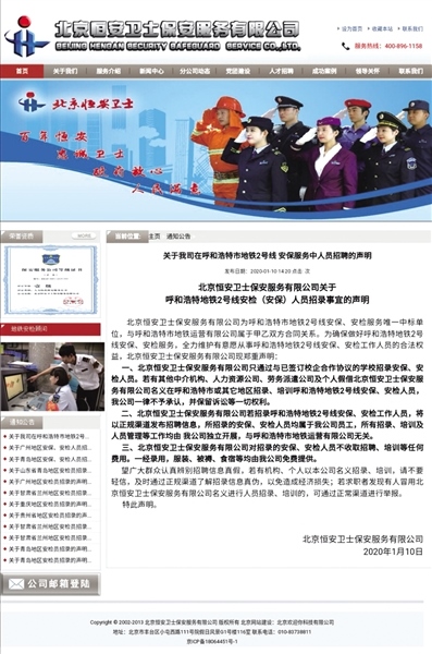 除了1號線和2號線安保,恒安衛(wèi)士還將為即將開通的地鐵2號線提供安檢服務(wù)。事實上,恒安衛(wèi)士近年來多次在全國多個城市引起地鐵安保安檢員高價招聘亂象。記者從恒安衛(wèi)士官網(wǎng)上看到,2015年9月至2020年1月,恒安衛(wèi)士先后發(fā)布20次聲明,就其公司在廣州、青島、南昌、南寧、蘭州、貴陽、重慶等城市引起高價招聘地鐵安檢、安保人員亂象做出辯解。最近的一次,則是1月20日發(fā)布的《關(guān)于我公司在呼和浩特市地鐵2號線安保服務(wù)中人員招聘的聲明》。