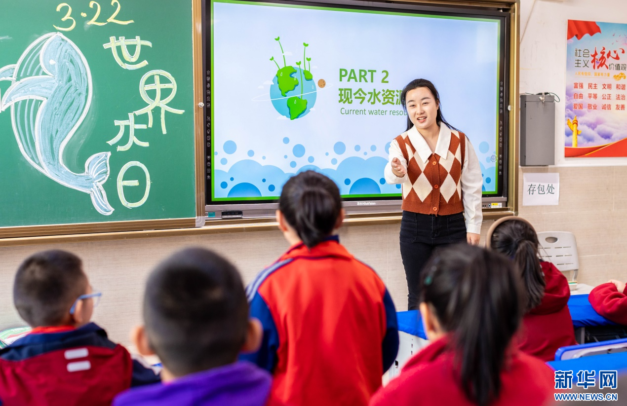 ??3月20日,呼和浩特市玉泉區(qū)石東路小學(xué)老師向?qū)W生們講解水資源現(xiàn)狀等知識(shí)。新華網(wǎng)發(fā)(丁根厚 攝)