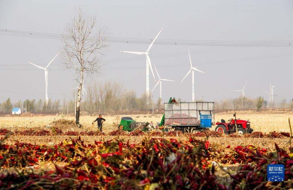 10月25日,在開魯縣東風(fēng)鎮(zhèn)東方紅村,村民收獲紅干椒。新華社記者 連振 攝