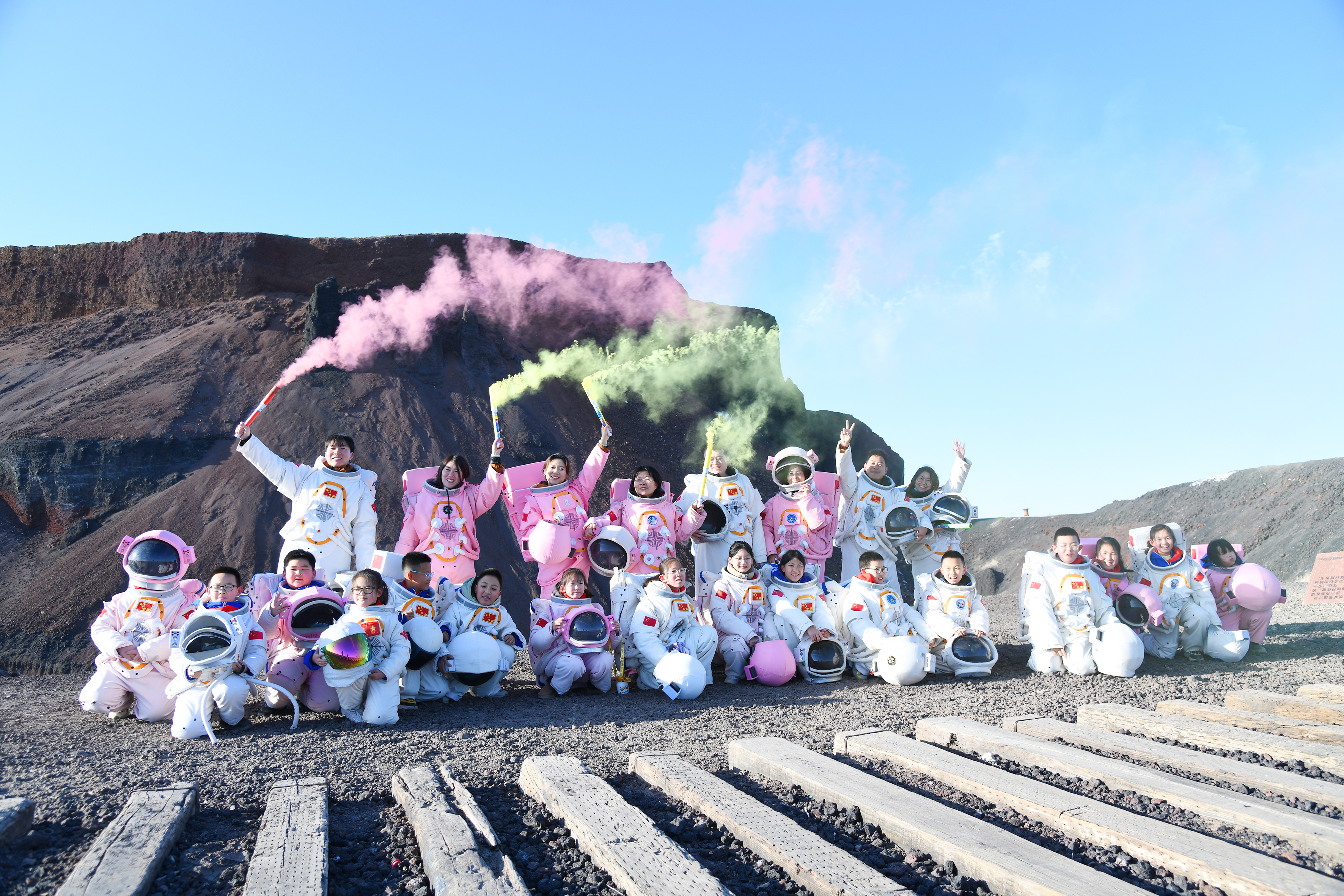 “我在火山,誰也不想!”“快幫我們拍張合影,簡直像在登陸火星?!痹跒跆m哈達火山地質(zhì)公園6號火山腳下,冬令營學員有的身著宇航服,手舉彩煙棒,紛紛擺出各種姿勢打卡拍照、分享留念;有的在老師的帶領下,沿著棧道撿拾火山石,并觀察石頭構造,與老師共同探究跨越萬年的地質(zhì)奇跡。