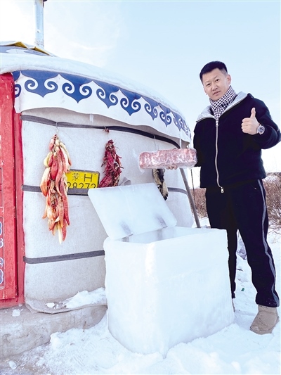 12月8日,記者幾經(jīng)周折與視頻中的小伙張智磊取得了聯(lián)系。張智磊今年36歲,從小在錫林郭勒大草原長大,在當(dāng)?shù)刂饕雠Q蛉馍狻τ谝馔庾呒t,張智磊直言自己也沒有想到。“視頻是在錫林浩特市南郊向陽村叔叔家院子里的蒙古包拍攝的。記得小時候,每到冬天,周邊牧民都是把食物埋在雪地里儲存。我前幾天也拍了一個從雪地里找羊腿的視頻,有粉絲留言‘放在雪地里會不會忘記位置容易丟了’,然后我就突發(fā)奇想,干脆做個‘冰箱’把年貨放進去?!睆堉抢诟嬖V記者,他從12月3日開始凍冰塊,12月4日把凍結(jié)實的冰塊拿出來用冷水黏合,因為冰塊低于0攝氏度,遇水就會瞬間黏在一起,然后開始著手打磨,棱棱角角都用電熨斗熨平整,再加上蓋,一個“冰箱”就完成了。