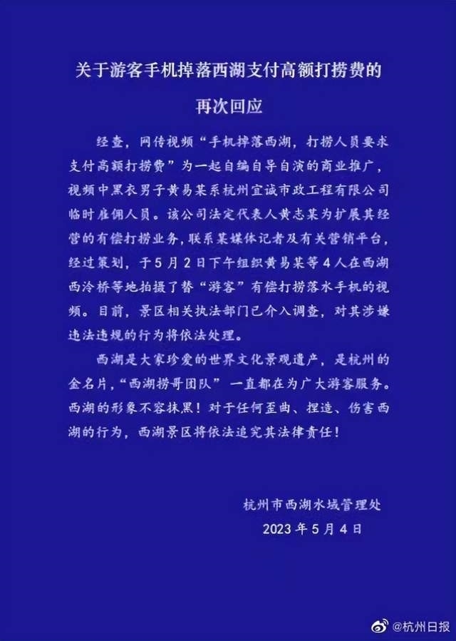 ·西湖景區(qū)再次回應(yīng)“高價(jià)撈手機(jī)事件”:為自編自導(dǎo)自演商業(yè)推廣。