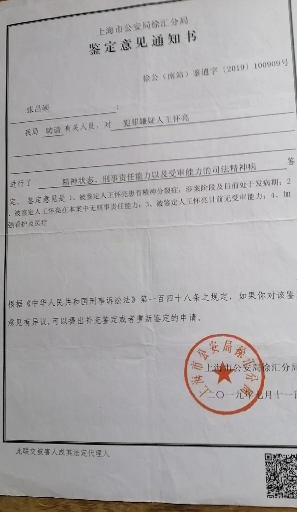 另一份是犯罪嫌疑人王懷亮的“精神狀態(tài)、刑事責(zé)任能力以及受審能力的司法精神病”鑒定書(shū),寫(xiě)道:王懷亮患有精神分裂癥,涉案階段及目前處于發(fā)病期;在本案中無(wú)刑事責(zé)任能力;目前無(wú)受審能力;加強(qiáng)看護(hù)及醫(yī)療。