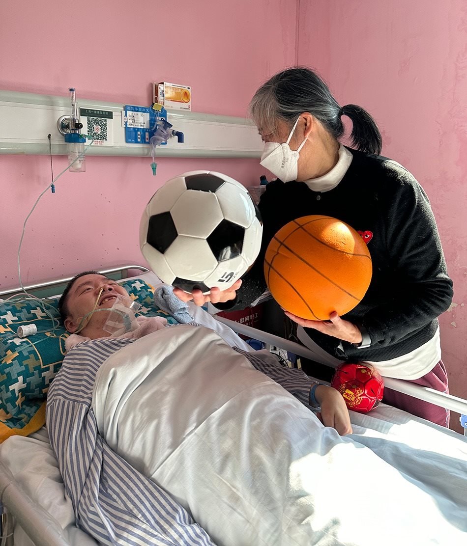 張昌碩恢復(fù)微小意識(shí)后,鄭建英從家里帶了兩顆昌碩最喜歡的足球到病床前,一大一小。每次,她舉起一顆足球放到他眼前,問(wèn)他:“哪只是曼聯(lián)的?”昌碩的視線(xiàn)會(huì)左右移動(dòng),選擇正確的那一顆。
