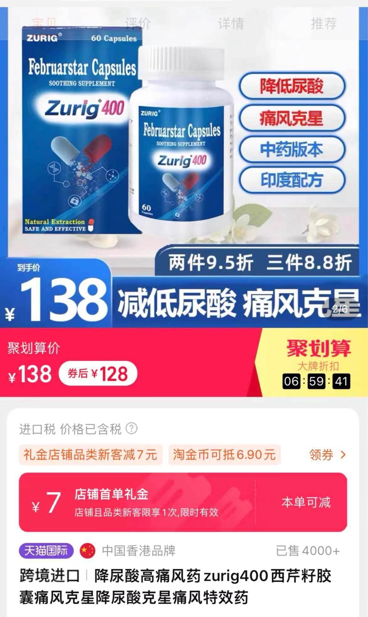 此外,zurig400在銷售頁面還模仿印度zurig80,宣稱降尿酸、痛風(fēng)藥。澎湃新聞記者調(diào)查發(fā)現(xiàn),zurig400目前在多個(gè)網(wǎng)購平臺有售,有商家顯示已出售4000+。 經(jīng)了解后得知,印度zurig80實(shí)際上是一款仿制藥,目前國內(nèi)并未獲批上市;而zurig400卻是一款香港產(chǎn)的保健品類目產(chǎn)品,并非藥品。但產(chǎn)品宣傳時(shí)卻使用“痛風(fēng)特效藥”“印度配方”“中藥非布”等詞語,讓患者產(chǎn)生誤會。