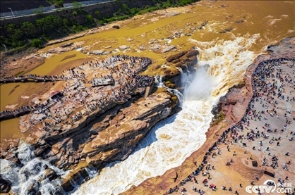 黃河壺口瀑布現(xiàn)“金流飛瀑”美景。