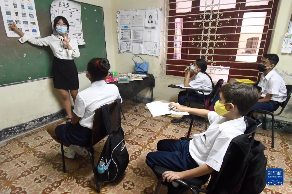 3月7日,中國(guó)教師侯嘉琪(左一)在古巴首都哈瓦那的羅德里格斯中學(xué)為學(xué)生上中文課。