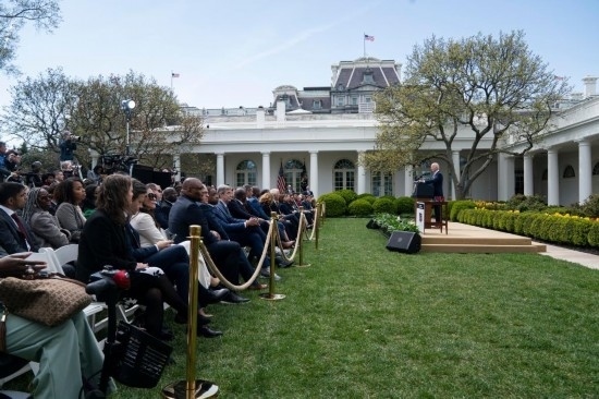 2022年4月11日,美國(guó)總統(tǒng)拜登(右一)在華盛頓白宮就監(jiān)管“幽靈槍”的新規(guī)發(fā)表講話(huà)。新華社記者劉杰攝