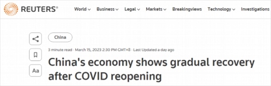 路透社也在15日的報道表示,盡管全球需求及房地產(chǎn)行業(yè)持續(xù)低迷,但2023年前兩個月中國經(jīng)濟活動在消費和基礎設施投資的推動下穩(wěn)步回升,從疫情的影響中恢復。