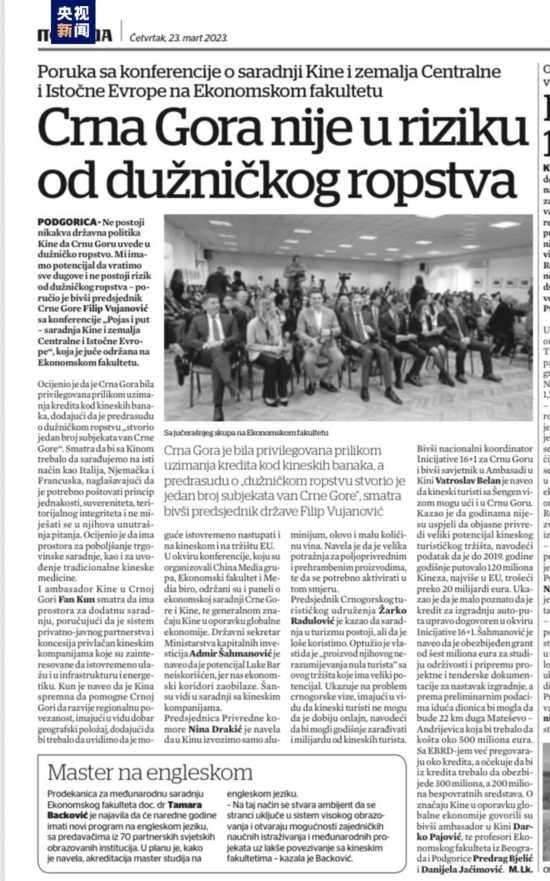 當?shù)貢r間3月22日,由中央廣播電視總臺歐洲拉美地區(qū)語言節(jié)目中心主辦、黑山媒體局視頻門戶網(wǎng)站和黑山大學經(jīng)濟學院共同承辦的“中國式現(xiàn)代化與世界新機遇”研討會在黑山首都波德戈里察舉行。黑山名譽總統(tǒng)武亞諾維奇、中國駐黑山大使范琨、黑山資本投資部國務秘書沙赫馬諾維奇、黑山前駐華大使帕約維奇等政要、專家學者、媒體代表及青年學生共200余人參會。