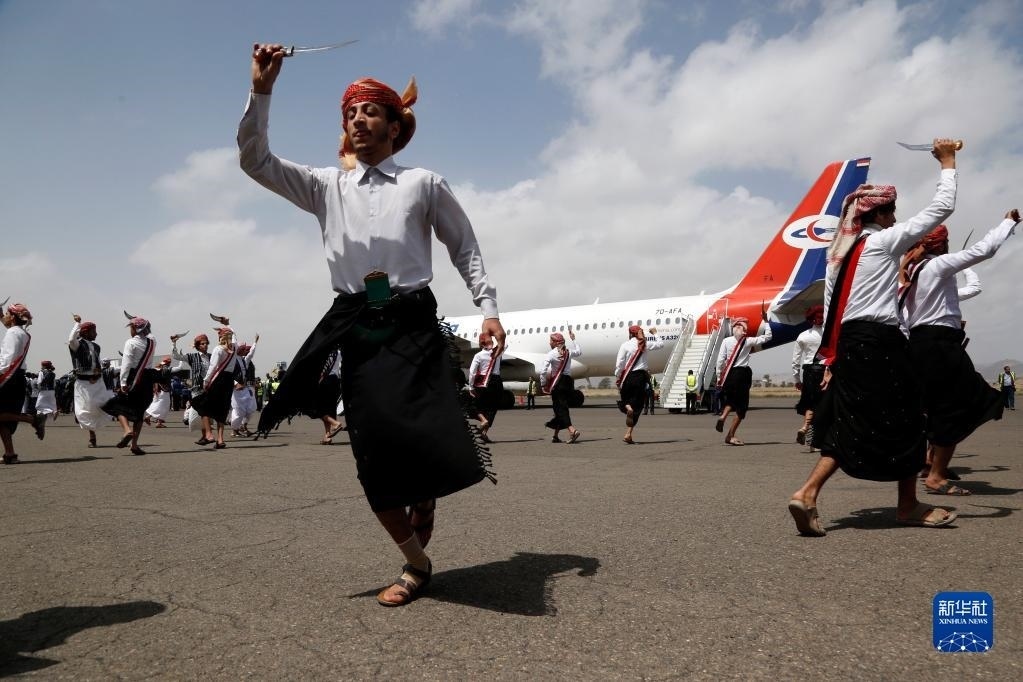 4月15日,在也門薩那機場,人們在歡迎戰(zhàn)俘歸來的儀式上跳舞。   新華社發(fā)(穆罕默德·穆罕默德 攝)