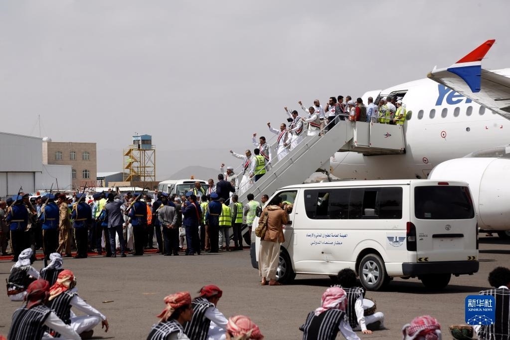 4月15日,在也門薩那機場,獲釋胡塞武裝戰(zhàn)俘走下飛機。   新華社發(fā)(穆罕默德·穆罕默德 攝)
