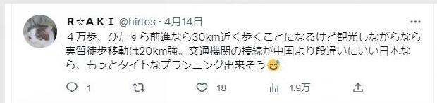 “4萬(wàn)步,直線距離相當(dāng)于將近30公里,不過(guò)如果是徒步邊走邊逛景點(diǎn),差不多是20來(lái)公里。如果在公共交通更便利的日本,應(yīng)該能壓縮出一個(gè)更緊湊的行程?!?/p>