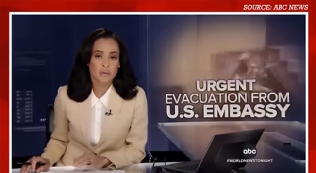 (安柏然所發(fā)視頻中,一名美媒主持人報(bào)道美國在夜間出動(dòng)直升機(jī)撤離美國外交官的畫面。)