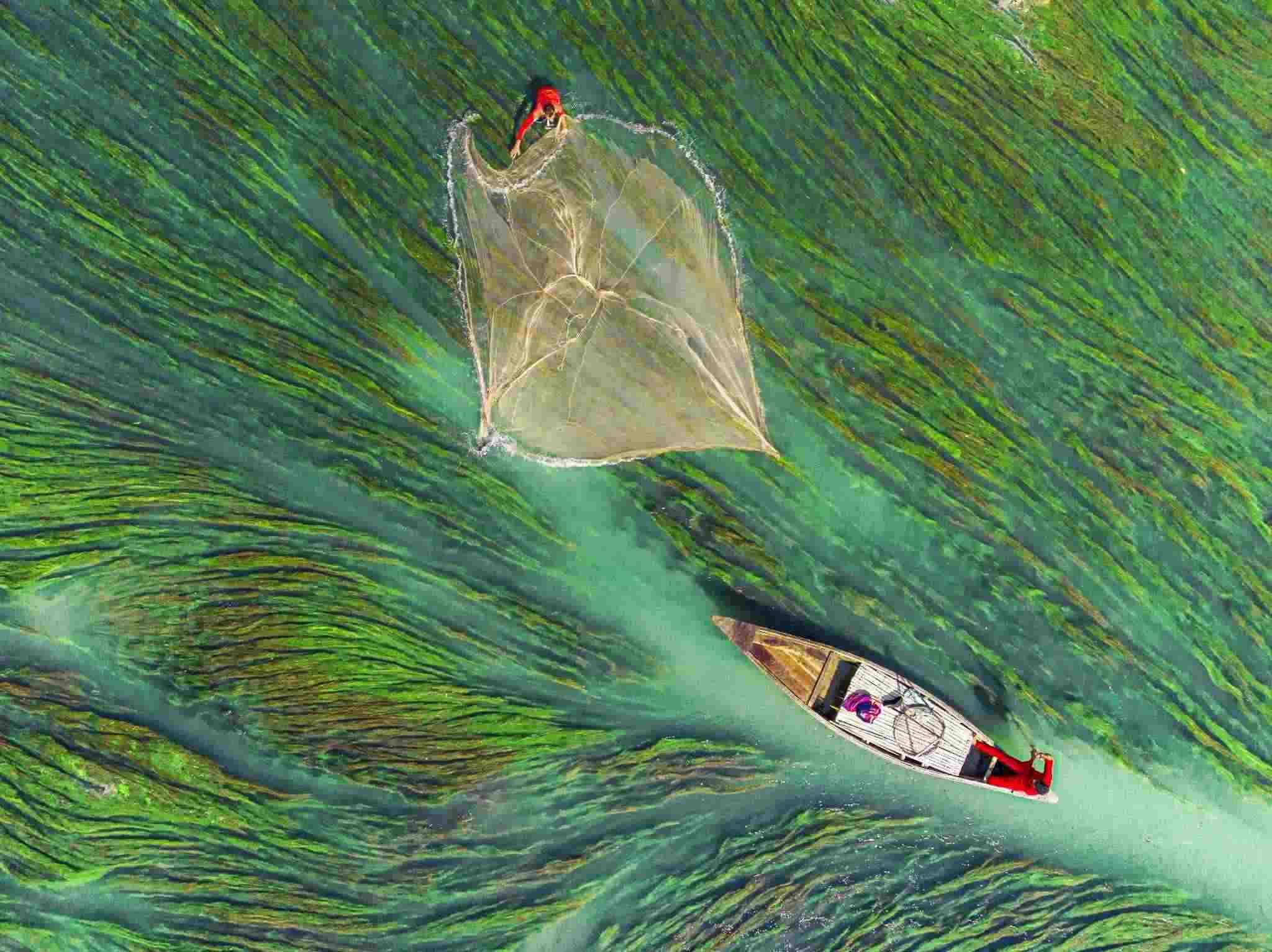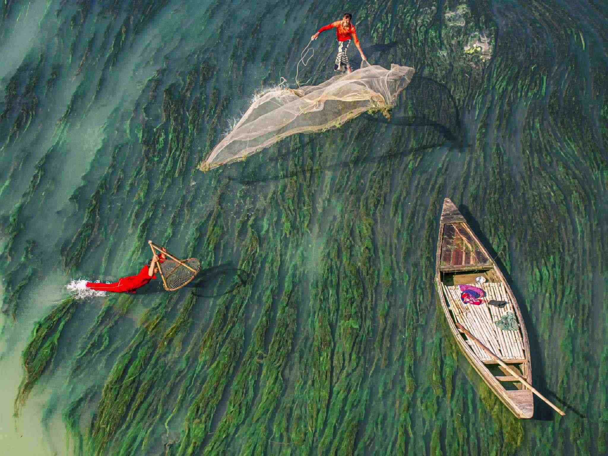 孟加拉拉杰沙希,漁民在河中撒網(wǎng)捕魚(yú),周圍被多彩的水藻包圍。視覺(jué)中國(guó)