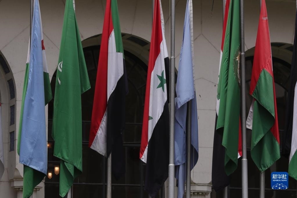 這是5月7日在位于埃及開(kāi)羅的阿拉伯國(guó)家聯(lián)盟總部拍攝的敘利亞國(guó)旗(左四)。