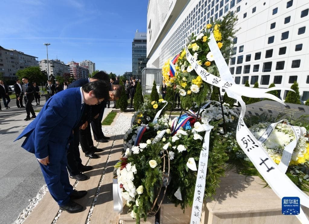 5月7日,在塞爾維亞貝爾格萊德,中資企業(yè)代表在中國駐南斯拉夫聯(lián)盟大使館舊址前的烈士紀(jì)念碑前肅立。