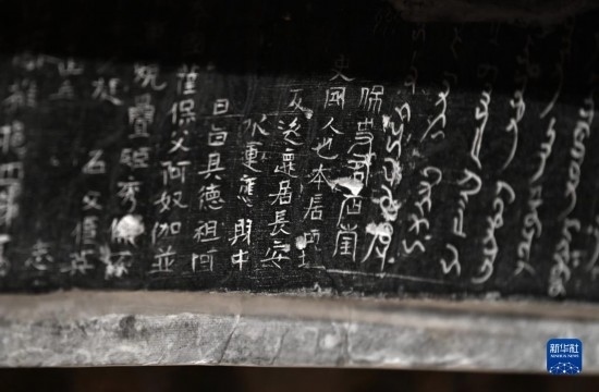 這是在西安博物院展出的史君墓石槨,槨門門楣上用漢文和粟特文刻著墓主墓志(5月8日攝)。墓主史君是北周涼州薩保,粟特人。石槨整體為中國傳統(tǒng)歇山頂?shù)钐檬浇ㄖ?,四壁浮雕?nèi)容和風格則帶有鮮明的西域特色。