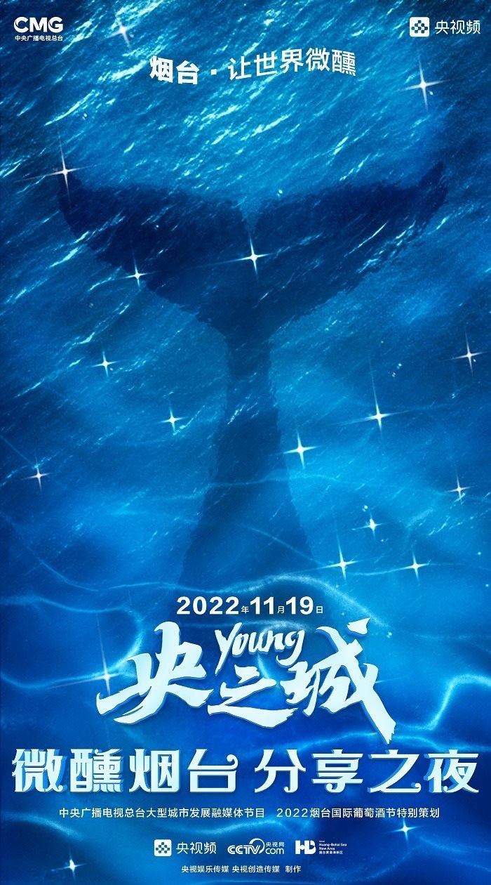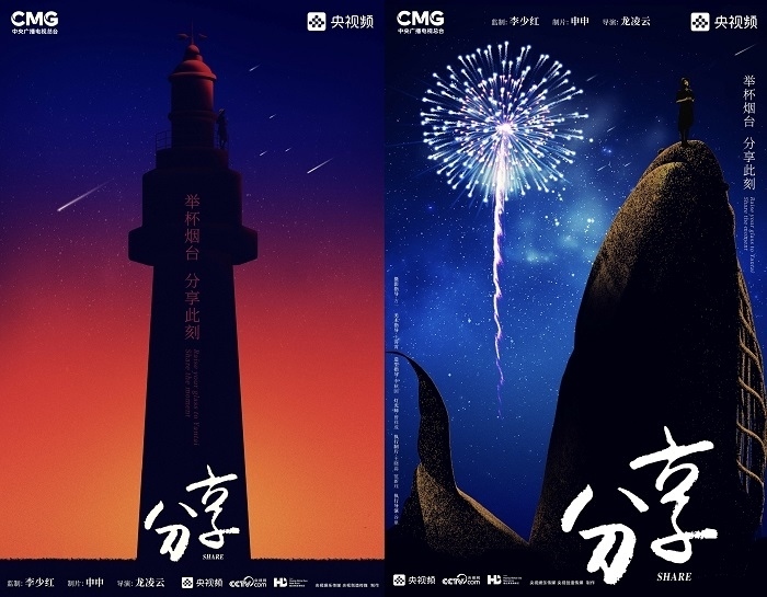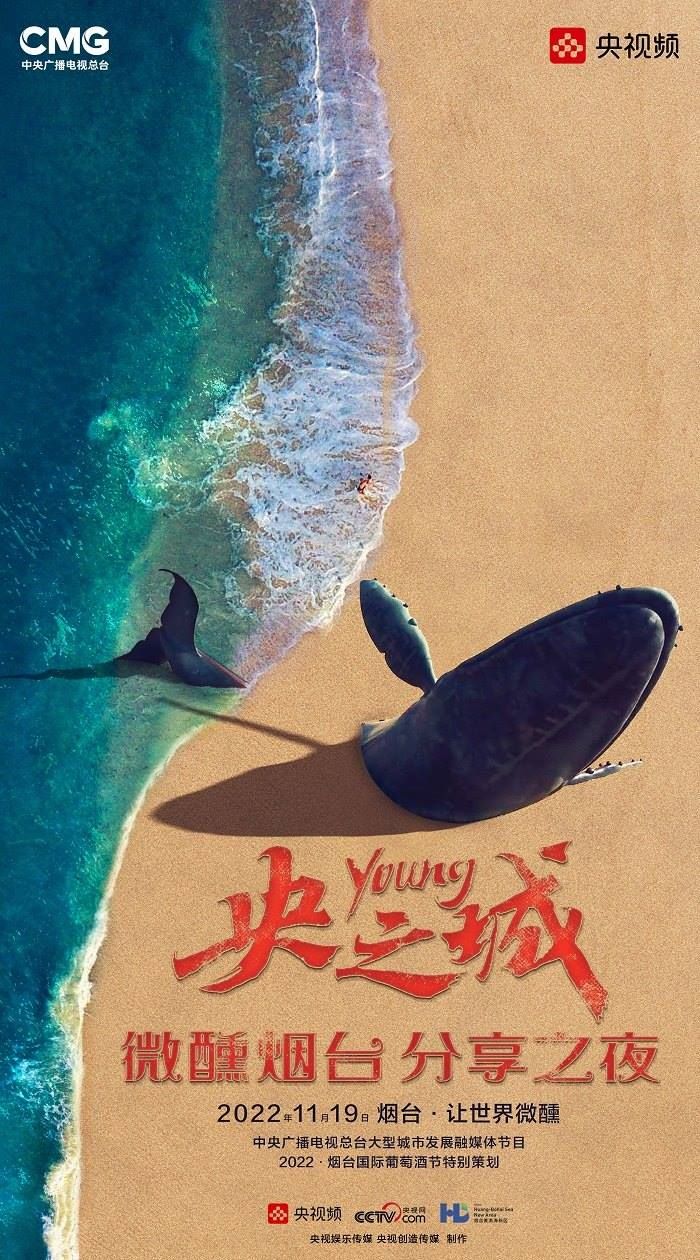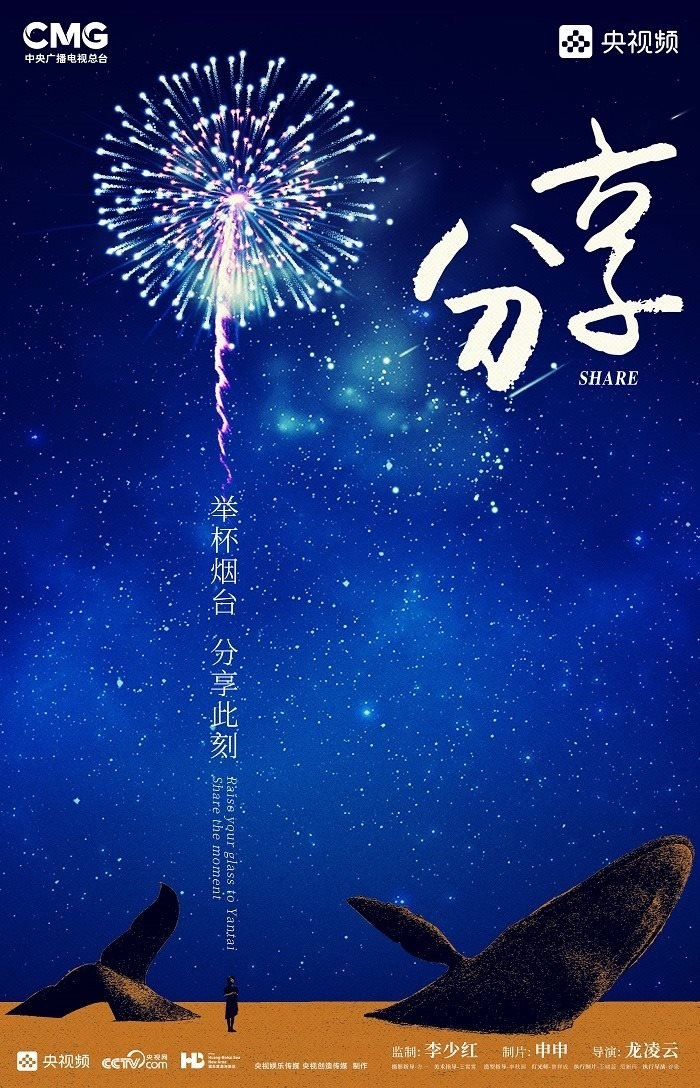 田雨峰在拍攝短片海報(bào)用圖的時(shí)候,首先確定了畫面中最突出的形象元素,同時(shí)也是交代短片故事發(fā)生地的地標(biāo)性雕塑——“孤獨(dú)的鯨“。這個(gè)雕塑如今是煙臺(tái)開(kāi)發(fā)區(qū)金沙灘的網(wǎng)紅打卡地,網(wǎng)友為其起名”鯨落“。碩大的鯨魚(yú)從淺海處躍出海面,魚(yú)頭和魚(yú)尾凌空飛躍,其身體的一部分似藏在沙灘里。這是一個(gè)在真實(shí)生活中不會(huì)出現(xiàn)的景象,充滿了動(dòng)畫般的奇幻想象,位于煙臺(tái)碧藍(lán)的海邊,又天然地帶上了一點(diǎn)浪漫的色彩。短片中”舉杯煙臺(tái),分享此刻“的Slogan綴在尾聲,分享的正是煙臺(tái)這座城市獨(dú)有的沙灘、夜空、煙火和人間。短片中可以娓娓道來(lái)般逐漸交代,但在海報(bào)里,二環(huán)用畫面底部金色沙灘上”孤獨(dú)的鯨“,畫面上方如大海般湛藍(lán)的星空,星空中綻放的煙花,鎖定了地球上唯一的煙臺(tái)。田雨峰鏡頭中短片主角的人物照被二環(huán)拼貼到童話般色彩斑斕的畫面里,被著意縮小了的黑色小女孩于是成為一切奇幻、浪漫想象的迸發(fā)之源,和世界分享一個(gè)妙趣橫生的想法。