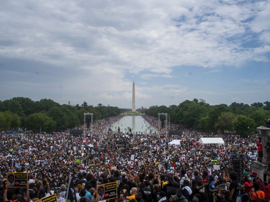 2020年8月28日,人們在美國首都華盛頓林肯紀念堂附近參加反種族歧視和暴力執(zhí)法示威活動。新華社發(fā)(阿蘭攝)