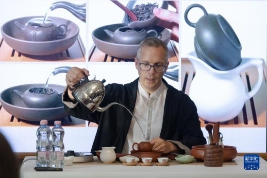 6月1日,在匈牙利布達(dá)佩斯,一名茶文化愛好者在“茶和天下·雅集”活動(dòng)上向嘉賓展示沖泡中國茶。新華社發(fā)(弗爾季·奧蒂洛攝)