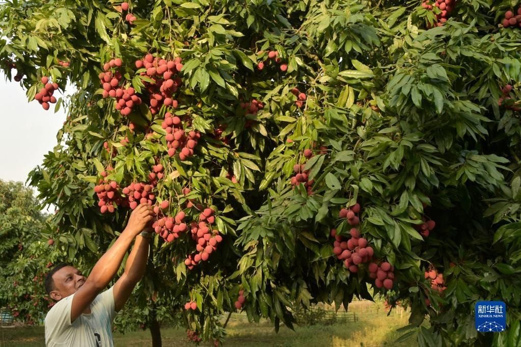 6月4日,農(nóng)民在孟加拉國迪納杰布爾的果園里采摘荔枝。新華社發(fā)
