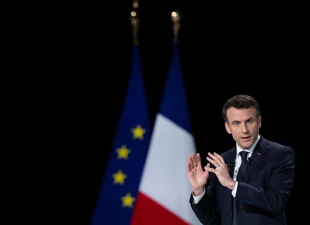2022年3月17日,法國總統(tǒng)馬克龍?jiān)诎屠璞苯既{-圣但尼省舉行的新聞發(fā)布會(huì)上介紹競選綱領(lǐng)。新華社發(fā)(肖恩·洛朗攝)