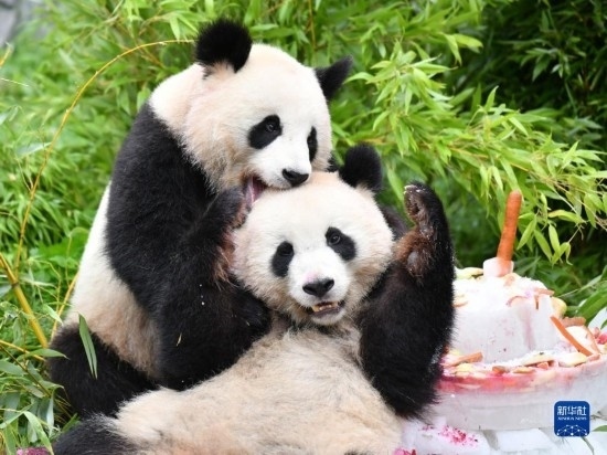 8月31日,大熊貓“夢(mèng)想”(左)和“夢(mèng)圓”在德國柏林動(dòng)物園享用“生日餐”。當(dāng)日,在德國出生的大熊貓雙胞胎兄弟“夢(mèng)想”和“夢(mèng)圓”迎來4歲生日,柏林動(dòng)物園為它們舉辦了慶祝活動(dòng)。新華社記者 任鵬飛 攝