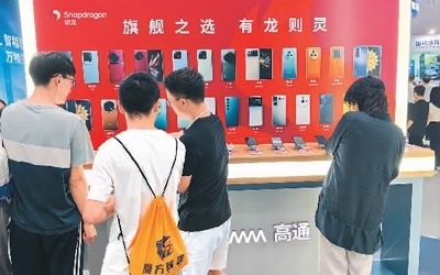 觀眾在高通展區(qū)體驗(yàn)搭載驍龍移動(dòng)平臺(tái)的智能手機(jī)。