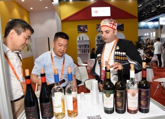9月4日,參展商在服貿(mào)會(huì)的格魯吉亞展臺(tái)品嘗格魯吉亞葡萄酒。新華社記者 武巍 攝