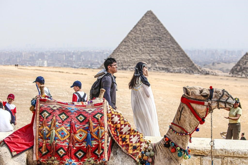 10月4日,中國(guó)游客在埃及吉薩金字塔景區(qū)游覽。(新華社發(fā),艾哈邁德·戈馬攝)