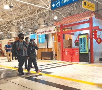 旅客經(jīng)過埃塞俄比亞博萊國際機(jī)場內(nèi)的中文服務(wù)臺。本報(bào)記者 萬 宇攝