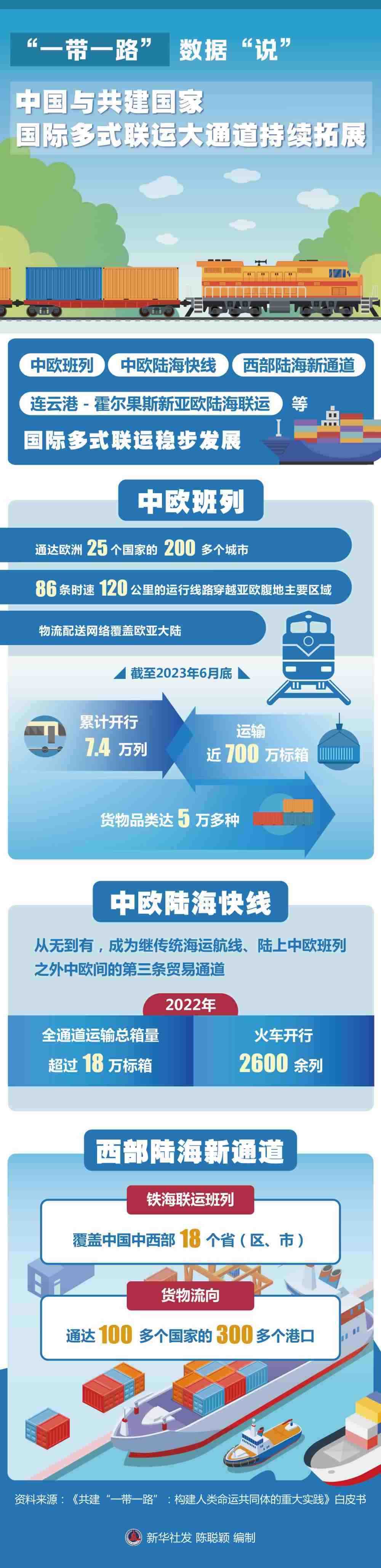 國(guó)際多式聯(lián)運(yùn)大通道持續(xù)拓展。中歐班列、中歐陸海快線(xiàn)、西部陸海新通道、連云港-霍爾果斯新亞歐陸海聯(lián)運(yùn)等國(guó)際多式聯(lián)運(yùn)穩(wěn)步發(fā)展。中歐班列通達(dá)歐洲25個(gè)國(guó)家的200多個(gè)城市,86條時(shí)速120公里的運(yùn)行線(xiàn)路穿越亞歐腹地主要區(qū)域,物流配送網(wǎng)絡(luò)覆蓋歐亞大陸;截至2023年6月底,中歐班列累計(jì)開(kāi)行7.4萬(wàn)列,運(yùn)輸近700萬(wàn)標(biāo)箱,貨物品類(lèi)達(dá)5萬(wàn)多種,涉及汽車(chē)整車(chē)、機(jī)械設(shè)備、電子產(chǎn)品等53大門(mén)類(lèi),合計(jì)貨值超3000億美元。中歐陸??炀€(xiàn)從無(wú)到有,成為繼傳統(tǒng)海運(yùn)航線(xiàn)、陸上中歐班列之外中歐間的第三條貿(mào)易通道,2022年全通道運(yùn)輸總箱量超過(guò)18萬(wàn)標(biāo)箱,火車(chē)開(kāi)行2600余列。西部陸海新通道鐵海聯(lián)運(yùn)班列覆蓋中國(guó)中西部18個(gè)?。▍^(qū)、市),貨物流向通達(dá)100多個(gè)國(guó)家的300多個(gè)港口。