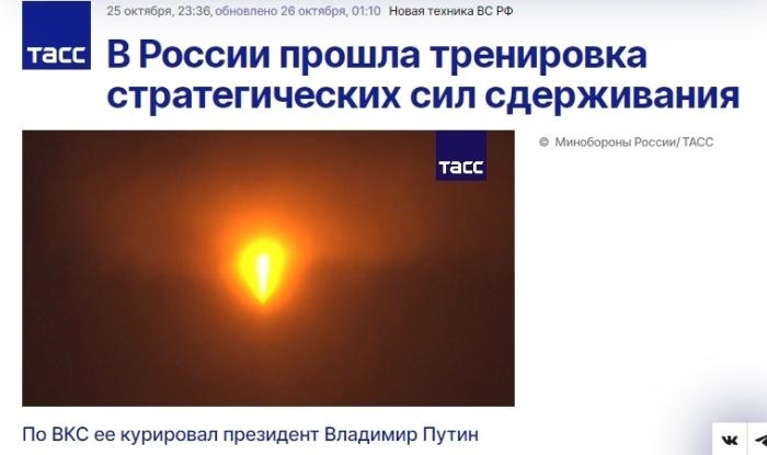 中新網(wǎng)10月27日電 據(jù)塔斯社報道,當?shù)貢r間25日,在俄軍最高統(tǒng)帥、俄總統(tǒng)普京的指揮下,俄羅斯武裝部隊進行了戰(zhàn)略核威懾力量演習。
