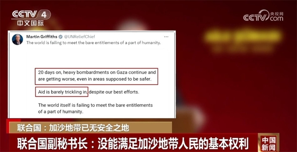 同一天,聯(lián)合國分管人道主義事務(wù)的副秘書長馬丁·格里菲斯在社交媒體發(fā)文稱,在過去20天里,對(duì)加沙地帶的猛烈轟炸愈發(fā)嚴(yán)重,一些本該安全的地區(qū)也已經(jīng)陷入危險(xiǎn),但援助物資卻很難進(jìn)入加沙地帶,國際社會(huì)沒能滿足一部分人的基本權(quán)利。
