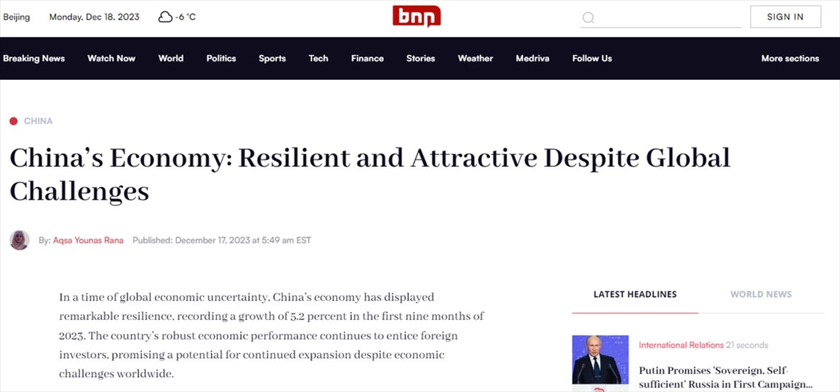 美國新聞網(wǎng)站BNN Breaking報道認(rèn)為,在全球經(jīng)濟(jì)充滿不確定性的背景下,中國經(jīng)濟(jì)表現(xiàn)出驚人的韌性,2023年前三季增長5.2%。