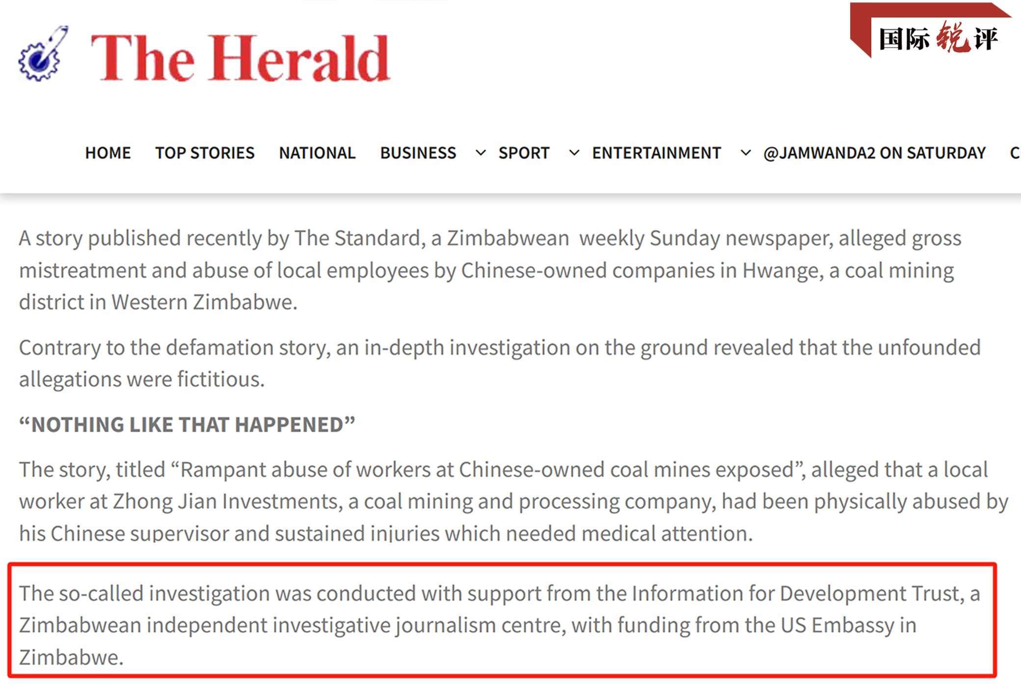 2022年5月,津巴布韋媒體《標(biāo)準(zhǔn)報(bào)》發(fā)布了一篇報(bào)道,污蔑中國(guó)礦企虐待當(dāng)?shù)貑T工,稱(chēng)這名員工“受傷送醫(yī),還被解雇了”。這家媒體稱(chēng),報(bào)道是和津巴布韋一個(gè)名叫“信息促進(jìn)發(fā)展信托基金(IDT)”的機(jī)構(gòu)合作完成的。然而很快,津巴布韋《先驅(qū)報(bào)》就發(fā)文,用大量事實(shí)證明,這名員工只是和中方員工發(fā)生了小口角,并沒(méi)有被毆打,也沒(méi)有被解雇。