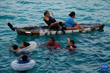 1月20日,瑙魯人在水中休閑娛樂。新華社記者 王申 攝