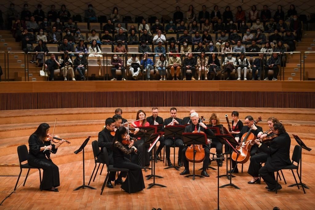 ?這是2023年11月16日拍攝的音樂會現(xiàn)場。當日,“費城之約”——費城交響樂團與蘇州交響樂團室內(nèi)樂音樂會在江蘇蘇州舉行。新華社記者 李博 攝