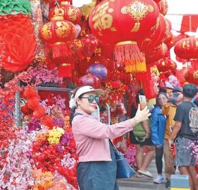 春節(jié)期間,印度尼西亞首都雅加達(dá)的中國城一派喜慶氣氛。圖為當(dāng)?shù)厥忻裨诮诌吷啼佔耘摹?/p>
