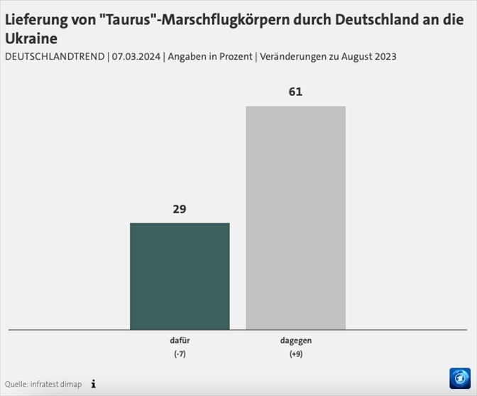 根據(jù)德國電視一臺當(dāng)?shù)貢r間7日公布的最新“德國趨勢”民調(diào),在“竊聽門”事件發(fā)生后,61%的德國民眾反對向烏克蘭提供“金牛座”巡航導(dǎo)彈,較去年8月的民調(diào)結(jié)果增長了9%;支持的民眾數(shù)量減少了7%,占比僅為29%。民調(diào)還顯示,70%的受訪者擔(dān)心間諜活動增加,67%的人擔(dān)心德國對此缺乏準(zhǔn)備,還有62%的民眾擔(dān)心德國可能會直接卷入戰(zhàn)爭。