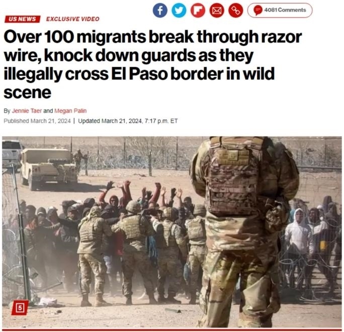 中新網(wǎng)3月22日電 綜合外媒報道,當?shù)貢r間21日,在得克薩斯州邊境墻附近,有上百名非法移民沖破鐵絲網(wǎng)試圖非法進入美國。他們撞倒得州國民警衛(wèi)隊成員,試圖越過美墨邊境,場面一度十分混亂。