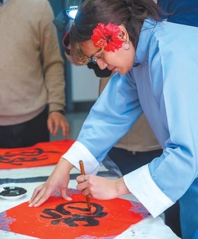 安雅在學(xué)校為留學(xué)生舉辦的新春活動上用毛筆書寫“?!弊帧J茉L者供圖