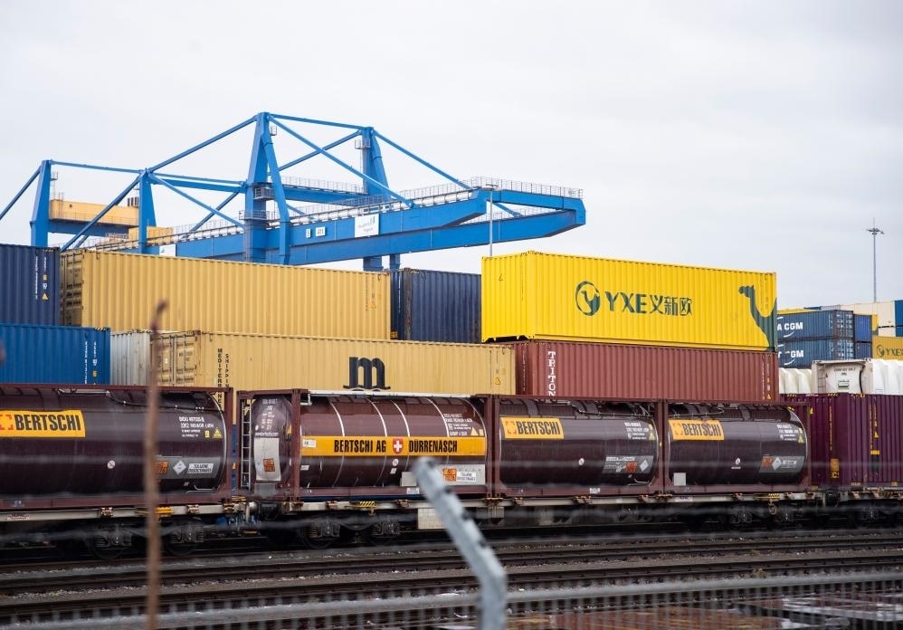 這是3月28日在德國杜伊斯堡一處貨運場站拍攝的集裝箱。