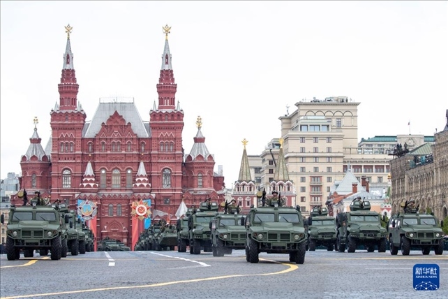 5月9日,在俄羅斯首都莫斯科,軍車編隊(duì)駛過紅場。新華社記者 曹陽 攝