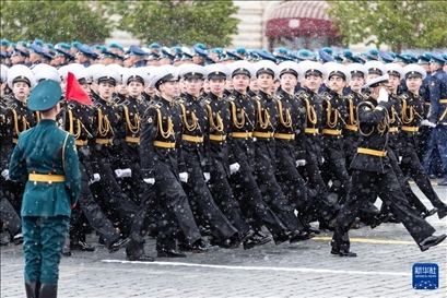 5月9日,在俄羅斯首都莫斯科,士兵列隊(duì)走過紅場。新華社記者 白雪騏 攝